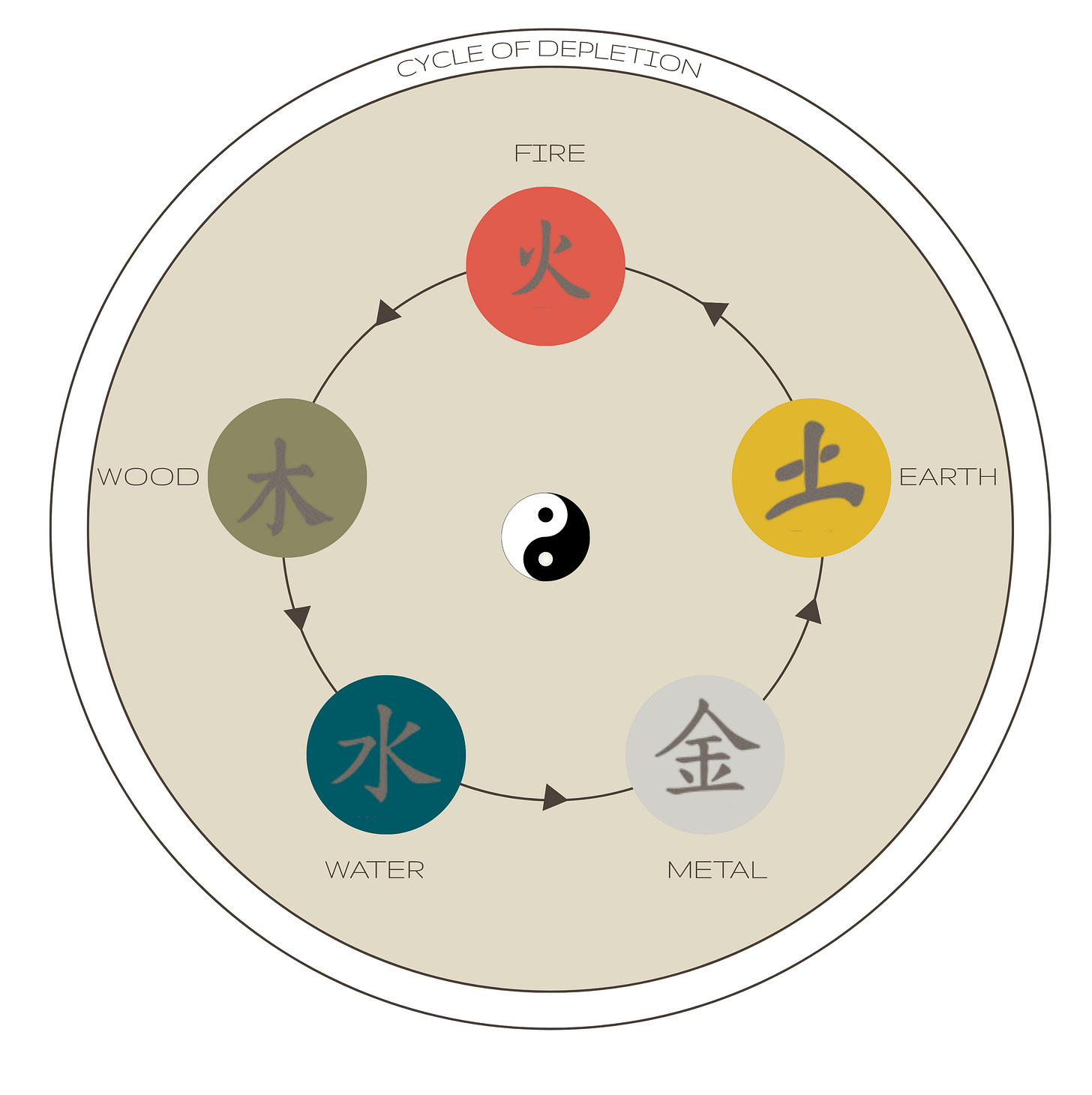 The opposite of the Cycle of Creation is the Cycle of Depletion (Reductive Cycle). When one element nourishes and supports another, it naturally becomes weakened - like giving part of itself to strengthen or energize the next, a quiet act of self-sacrifice. It runs in a counter-clockwise direction.