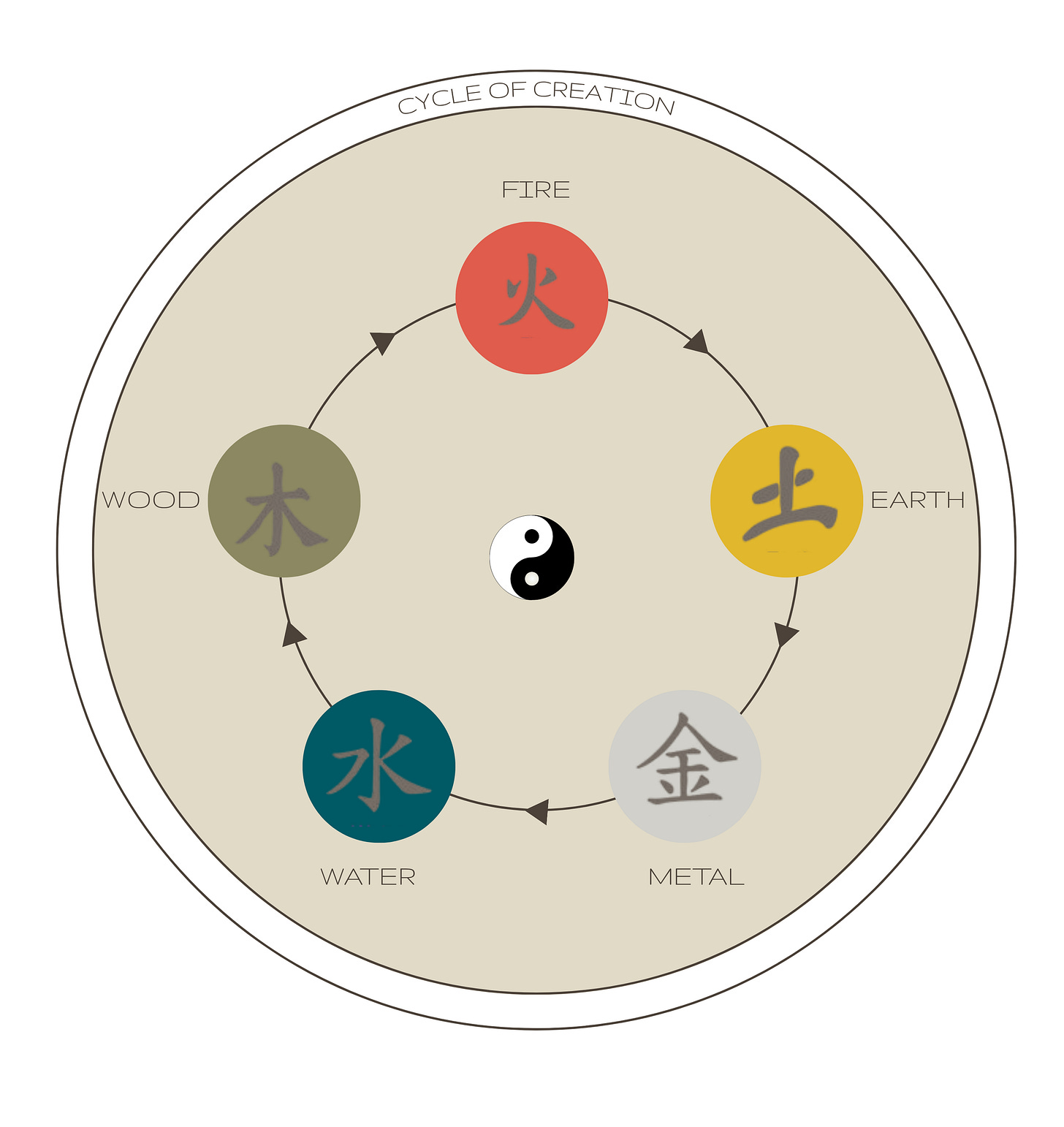 Because the eight characters that our chart is made up of (mentioned in the previous post) are either an element (heavenly stem) or a hidden element within the animal sign (earthly branches) and understanding the relationship of the elements therefore helps us understand if the elements in our chart are in balance, need to be brought to balance or if they are in conflict with one another.